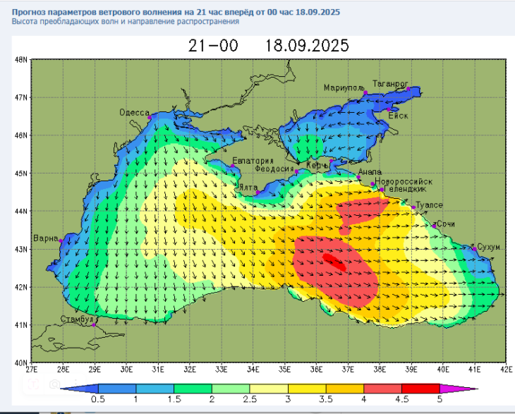 По данным системы эпицентр стихии к 21 часу затронет западное побережье и ЮБК. У берегов Евпатории волны высотой до 1,5 метра, в Ялте шторм сильнее - там прогнозируются 2,5 метровые, как и у берегов Феодосии.