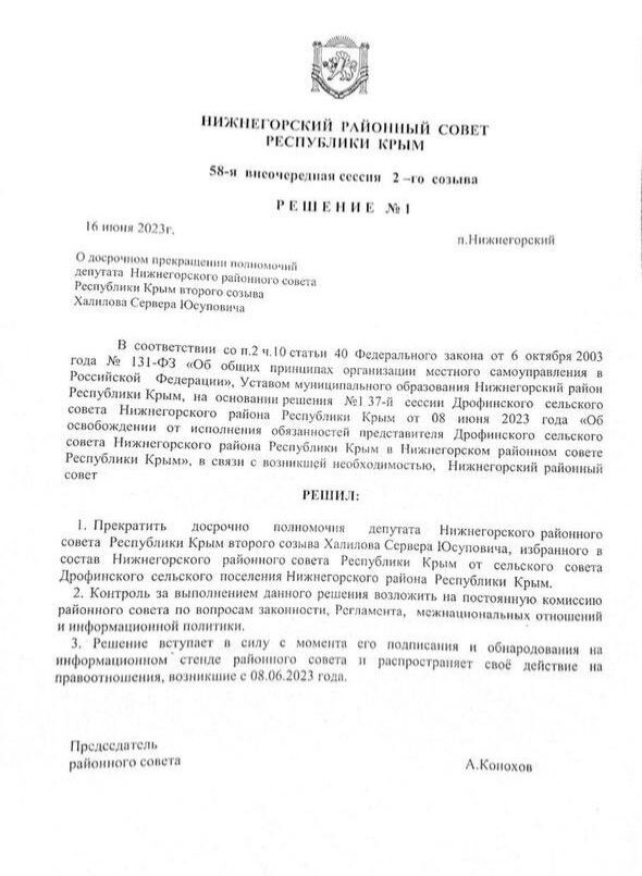 «Прекратить досрочно полномочия депутата Нижнегорского районного совета Республики Крым, избранного в состав Нижнегорского районного совета от сельского совета Дрофинского сельского поселения», — говорится в тексте документа.