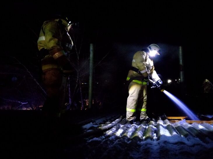 Прибыв на место, пожарные обнаружили, что огонь охватил крышу бани. Рядом находился гараж, который мог загореться. Пожарные провели разведку и унесли 1 газовый баллон подальше от огня. Затем они приступили к тушению пожара. Спустя 50 минут огонь был потушен. Площадь пожара составила 10 кв.м. Огнём была повреждена крыша бани. Люди не пострадали. Причина пожара выясняется.