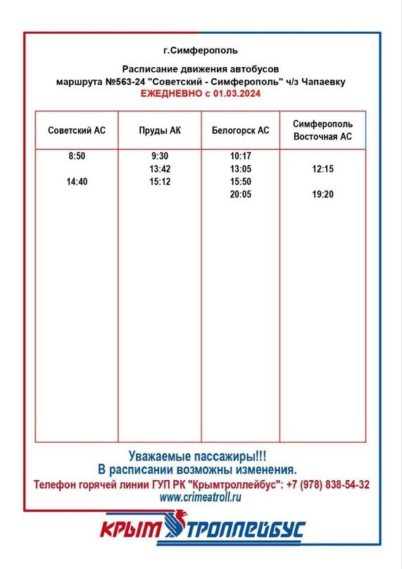 С 1 марта ГУП РК «Крымтроллейбус» запускает новый автобусный маршрут 563-24 «Советский — Симферополь» через Чапаевку. Об этом сообщили в пресс-службе министерства транспорта РК.