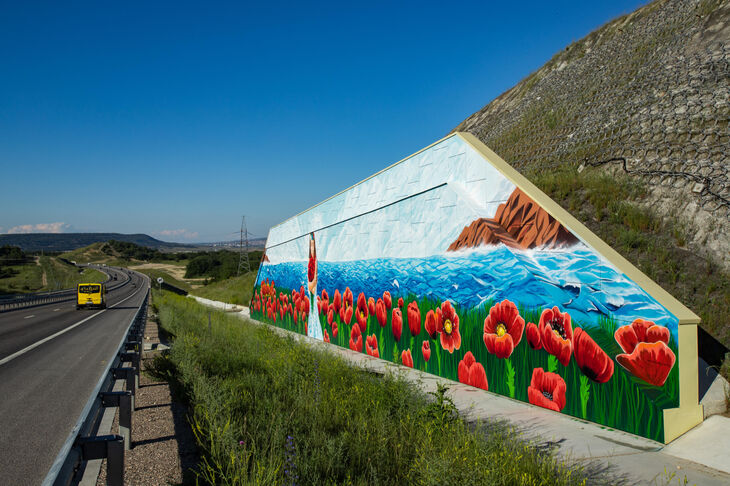 Это уже седьмой мурал, который художники арт-кластера «Таврида» нарисовали вдоль главной дороги Крымского полуострова.