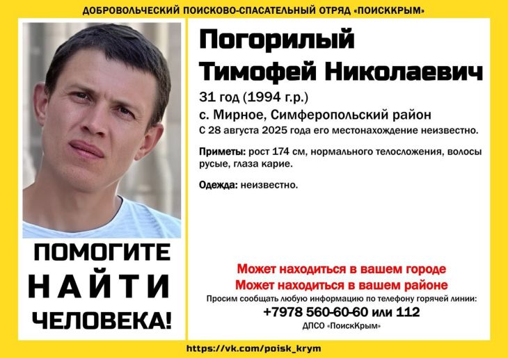 В селе Мирное Симферопольского района ведутся поиски 31-летнего Тимофея Погорилого. Как сообщили в добровольческом поисково-спасательном ...