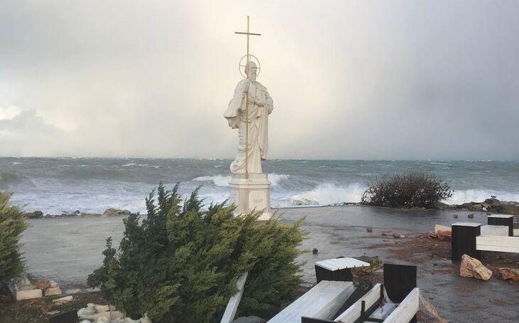 Сильный ураган с волнами до 8 метров размыл набережную имени Андрея Первозванного в Севастополе, однако памятник апостолу стоит целым и невредимым посреди всех разрушений.