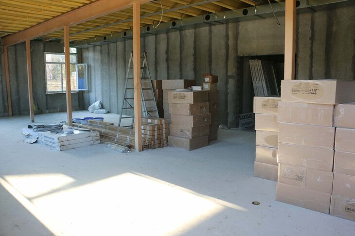 В соответствии с графиком работ возведено двухэтажное административное модульное здание, которое уже подключено к водопроводно-канализационным сетям. Сейчас в административном здании одновременно трудятся три бригады. Отделочники выполняют внутренние отделочные работы. Электрики заняты электромонтажными работами — прокладкой электрокабеля, установкой розеток и выключателей. Бригада вентиляционщиков ведет монтаж вентиляции.