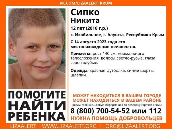 Под Алуштой, в селе Изобильное без вести пропал 12-летний Никита Сипко. С 14 августа о его местонахождении ничего неизвестно. Об это сообщили в поисковом отряде «ЛизаАлерт» Крым.