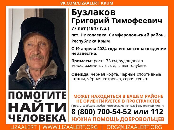 19 апреля ушел и не вернулся домой 77-летний житель пгт Николаевка Григорий Бузлаков. Об этом сообщили в поисковом отряде «ЛизаАлерт».