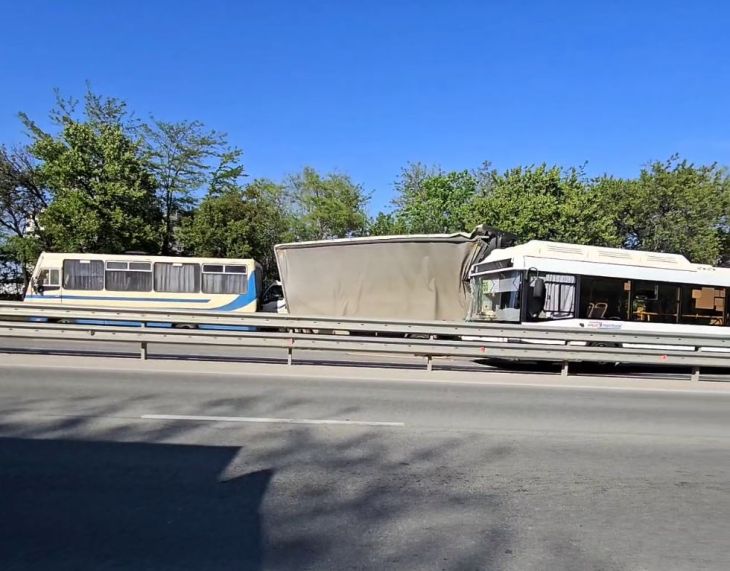 Как сообщают очевидцы, грузовик столкнулся с рейсовым автобусом, после чего в грузовик въехал маршрутный автобус.