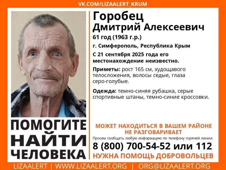 В Симферополе 21 сентября пропал Горобец Дмитрий Алексеевич, сообщает поисково-спасательный отряд «Лиза Алерт» Крым. Приметы: ...