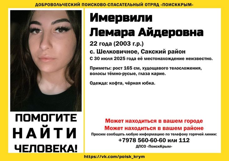 В селе Шелковичное Сакского района пропала Лемара Имервили. Девушка 30 июля ушла из дома и не вернулась. Где она до сих пор - неизвест...