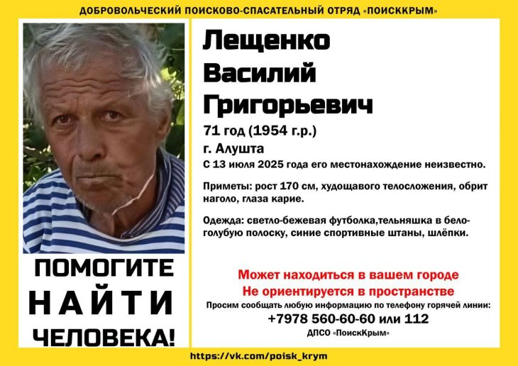 В Алуште почти неделю ведутся поиски пропавшего Василия Лещенко. Пожилой мужчина ушёл из дома 13 июля до сих пор о его местонахождении ничег...