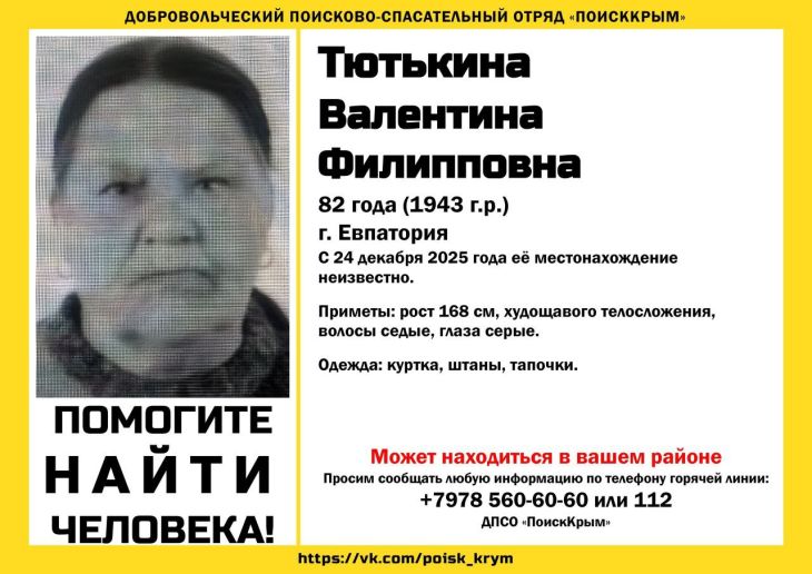 В Евпатории третьи сутки ищут 82-летнюю Валентину Тютькину. Женщина ушла из дома 24 декабря и не вернулась, поиски волонтеров результатов не...