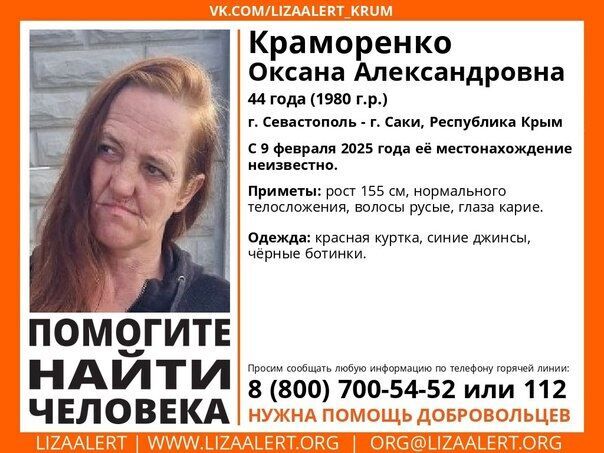 С 9 февраля о местонахождении Оксаны Краморенко ничего не известно. Женщина может находиться в Севастополе или городе Саки. Об этом сообщил ...