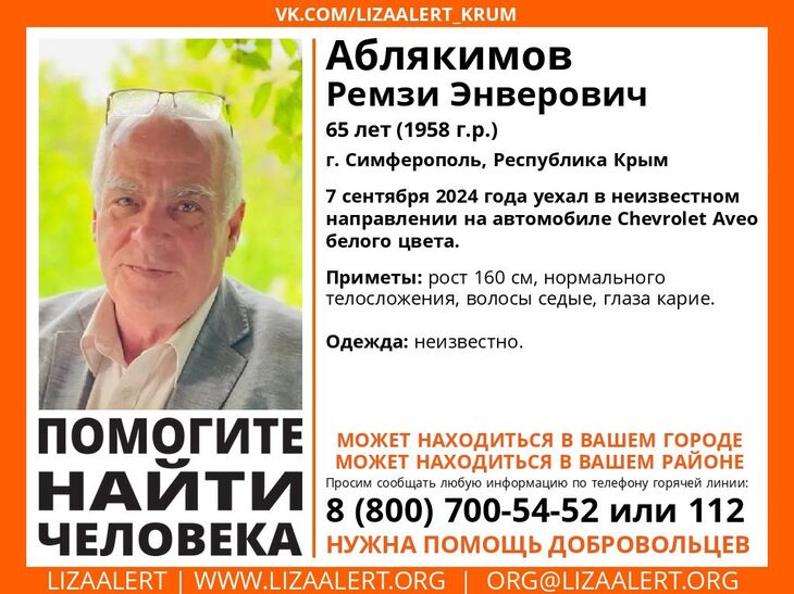 В Крыму уже неделю ищут пропавшего 65-летнего Ремзи Энверовича Аблякимова. Мужчина уехал в неизвестном направлении на прошлой неделе. Местон...