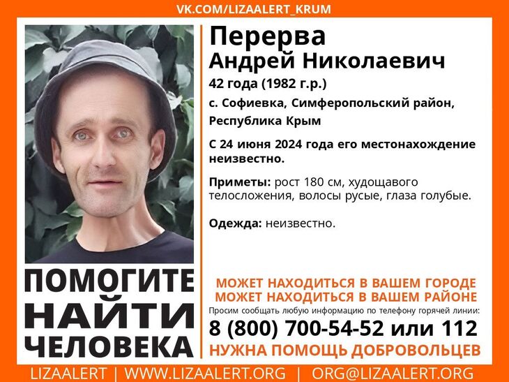 В селе Софиевка (Симферопольский район) вышел из дома и не вернулся 42-летний Андрей Николаевич Перерва. Поиски мужчины ведутся с 24...