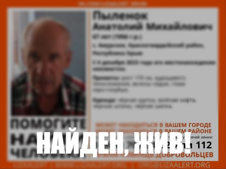 11 декабря был объявлен розыск пропавшего Анатолия Михайловича 1956 года рождения из Красногвардейского района. Об этом сообщил поисковый отряд «ЛизаАлерт».
