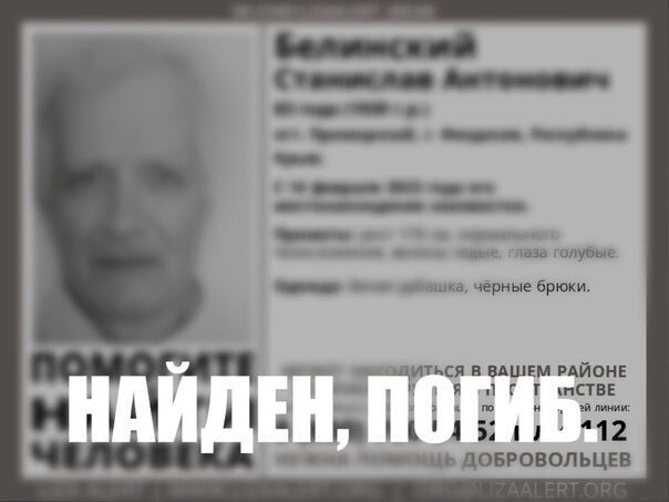 В пгт Приморском, что под Феодосией, без вести пропал 83-летний Белинский Станислав Антонович. Он ушел из дома 14 февраля текущего года, спустя полтора месяца его нашли мертвым.