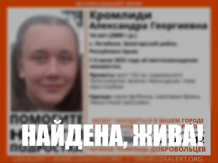 14-летняя Александра Кромлиди без вести пропала в селе Лекарственное, Белогорского района. Спустя три дня ее нашли живой. Об этом сообщили в поисковом отряде «ЛизаАлерт» Крым.