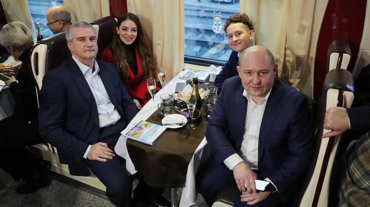 Глава Крыма сел на поезд на железнодорожном вокзале Симферополя, чтобы проехать в Севастополь вместе с руководителем Ростуризма Зариной Догузовой и ветераном Великой Отечественной войны, освободителем городов Керчь и Севастополь Александром Поповым.