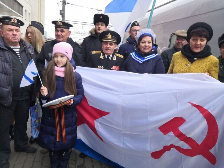 На перроне вокзала его встречали сотни крымчан. В том числе Глава Республики Крым Сергей Аксёнов и врио Губернатора Севастополя Михаил Развожаев.