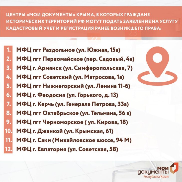 Перечень центров «Мои Документы» Крыма, где доступна данная услуга, прилагается.