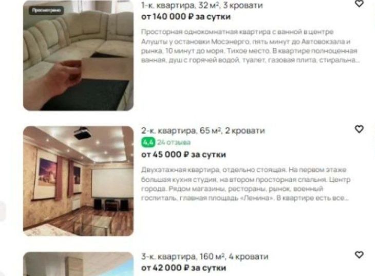 Возглавила ТОП, как и на Новый год, однушка в Алуште, которую предлагают взять в аренду за 140 тысяч рублей в сутки. При этом с питомцами туда нельзя, курить тоже запрещено, вечеринки не проводить. В квартире диван-кровать и два раскладных кресла. Всё это столь дорогое великолепие располагается на 3-м этаже пятиэтажки. Там есть холодильник, плита, стиралка и утюг, а ещё — интернет. Рядом остановка, до моря десять минут, говорится в объявлении. Кстати, пишут, что горячая вода тоже есть, а ещё и — туалет.