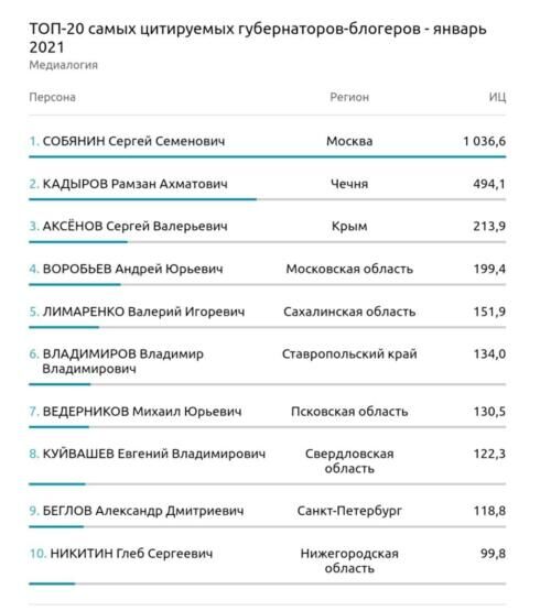 Глава Республики Крым Сергей Аксёнов занял третье место в медиарейтинге самых цитируемых губернаторов-блогеров за январь 2021 года. Результаты рейтинга опубликованы на сайте информационно-аналитической системы «Медиалогия».