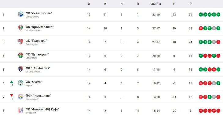 После 14 тура турнирную таблицу Премьер-лиги уверенно возглавляет «Севастополь». Позиции «Крымтеплицы», которая идет на втором месте, также кажутся незыблемыми. «Гвардеец», даже несмотря на обидную осечку в последнем матче, по-прежнему идет на третьем месте. Внизу таблицы печально выглядит лишь клуб из Феодосии. Но все может измениться после зимней паузы.