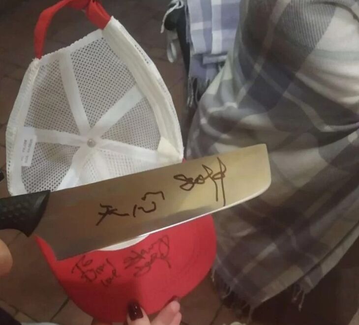 «Как-то кормили в ресторане этого знаменитого дядю, после совместных фото с персоналом, попросил автограф на ноже и на кепке. Кепка подписана «Для Димы», — написано в описании объявления.