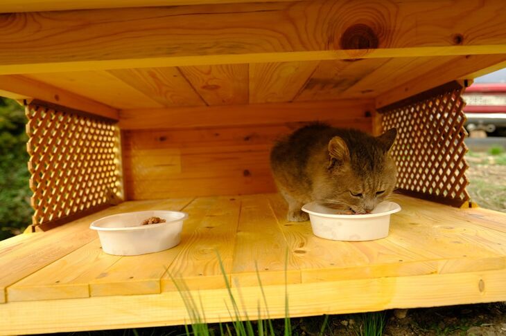 На просьбу местных жителей о домике для бездомных кошек откликнулся центр помощи «Переправа», подопечные которого подошли к вопросу основательно и творчески.
