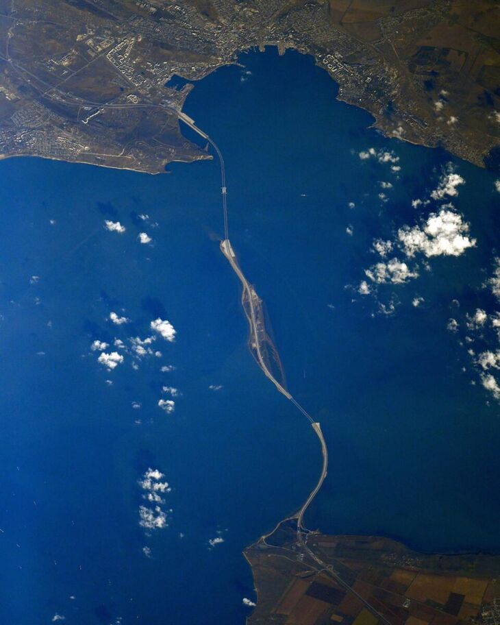 Космонавт из Севастополя Антон Шкаплеров запечатлел на фото Крымский мост с борта МКС. Фото он выложил на своей странице в Инстаграме.