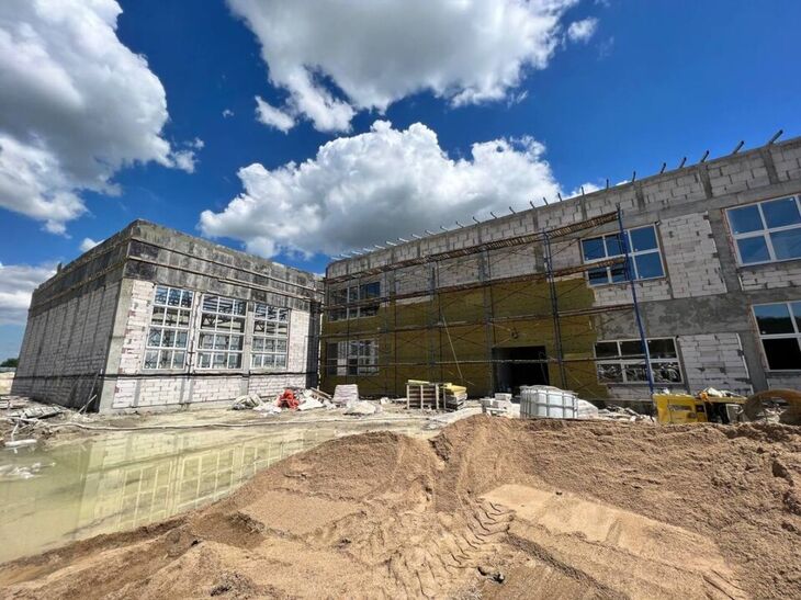 Продолжаются отделочные работы по лицевой декоративной штукатурке и вертикальной планировке здания. Активными темпами ведётся благоустройство прилегающей территории, проводятся работы под спортивную и игровые площадки вблизи будущей школы.