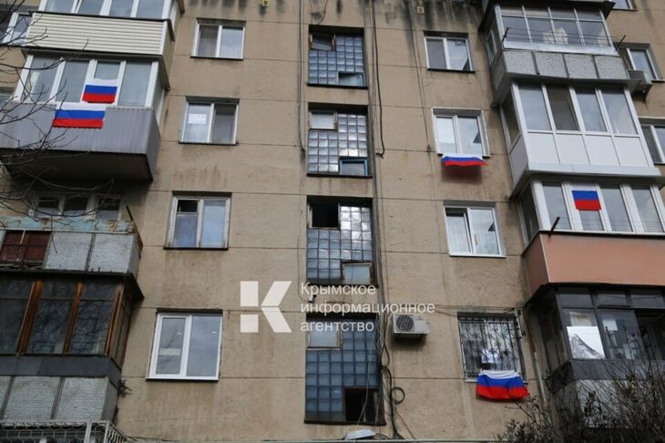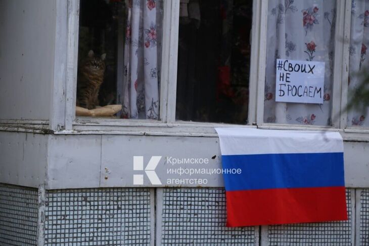 На всё большем количестве домов в Симферополе появляются российские флаги и плакаты с хештегом #своихнебросаем.