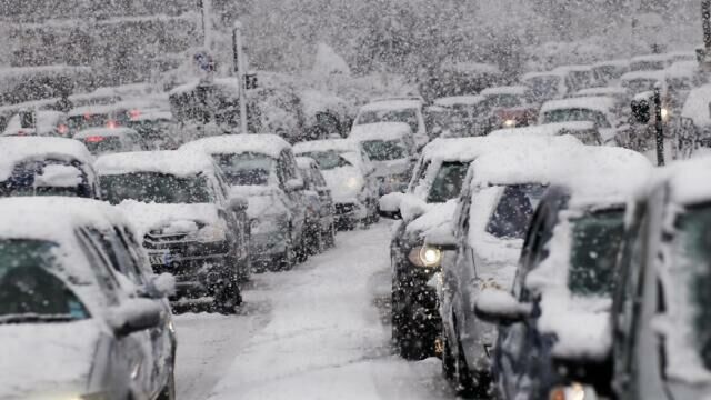 Снежный затор образовался на съезде с Крымского моста в сторону Керчи