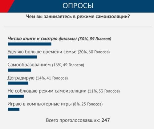 Опрос, проведённый на сайте «Крымского информационного агентства», показал, что большая часть жителей полуострова использует карантин, как возможность заняться тем, на что раньше не хватало времени. Например, 30% читают книги и смотрят фильмы.
