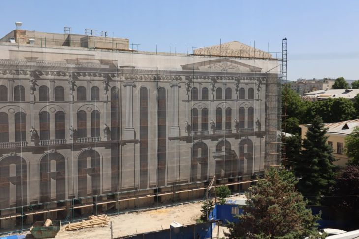Фасад здания театра кукол уже готов. В ближайшее время на нем закрепят навесные элементы, после чего начнется демонтаж лесов.