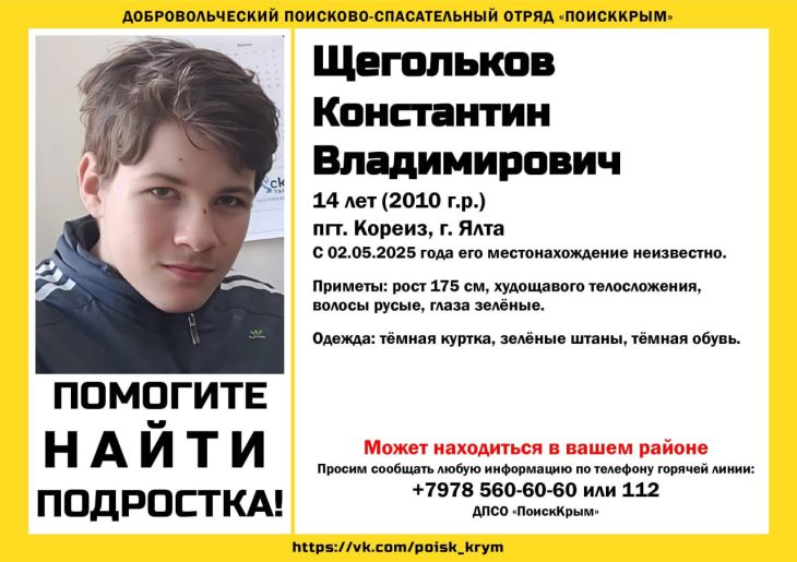 2 мая ушёл из дома и не вернулся Константин Щегольков. Подростка ищут в пгт. Кореиз Ялтинского округа. Об этом сообщили в пресс-службе поисково-спасательного отряда «ПоискКрым».