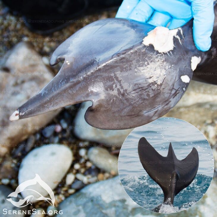 У берегов Алушты местные жители нашли мёртвого новорожденного дельфина-афалину со странным хвостом похожим на трезубец. Как сообщает центр реабилитации дельфинов «Безмятежное море», аналогичный дельфин был найден у крымского побережья в 2019 году.