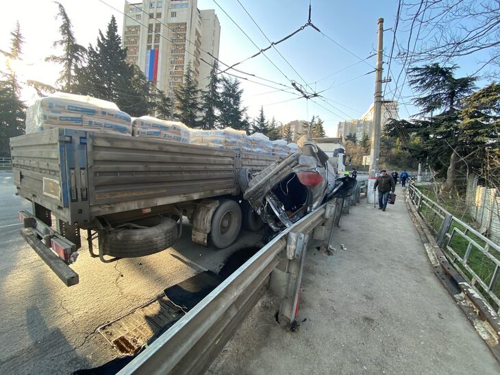 В Алуште грузовик раздавил легковушку об отбойник