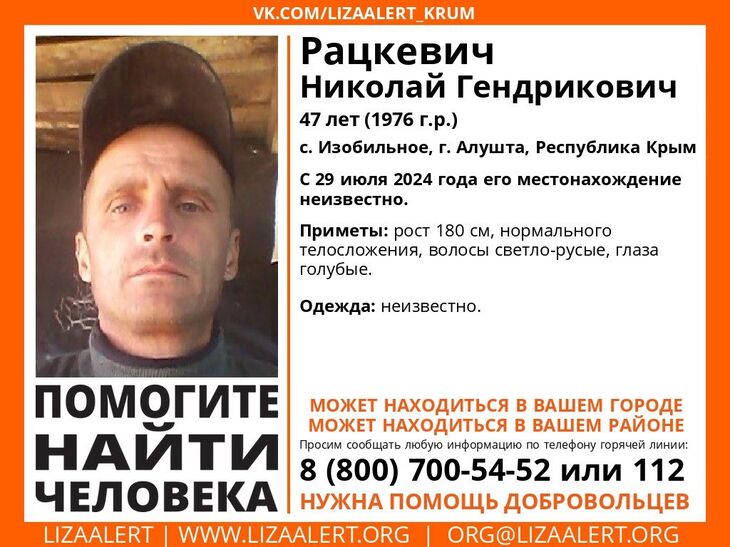 В селе Изобильном (район Алушты) 29 июля ушёл из дома и не вернулся Николай Рацкевич. Поиски мужчины ведутся пятые сутки. Об этом сообщил поисково-спасательный отряд «Лиза Алерт» Крым.
