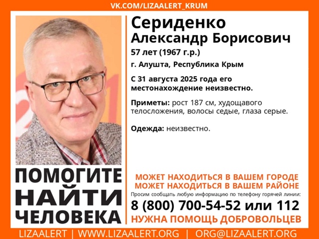 В Алуште пропал Сериденко Александр Борисович, 1967 года рождения. С 31 августа 2025 года его местонахождение неизвестно, сообщили в поисковом отряде ПОИСККРЫМ.