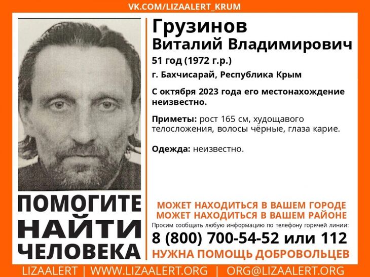 Волонтёры крымского отделения поискового отряда «Лиза Алерт» в Бахчисарае разыскивают 51-летнего Виталия Грузинова, чьё местонахождение неизвестно с октября этого года.