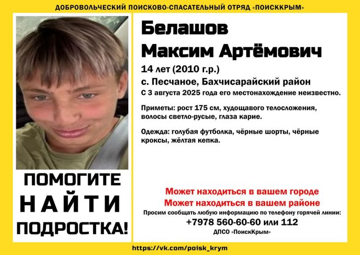 В селе Песчаное в Бахчисарайском районе вчера пропал Максим Белашов. Парень ушёл из дома 3 августа и до сих пор о его местонахождении ничего не известно. Об этом сообщает добровольческий поисково-спасательный отряд «ПОИСККРЫМ».