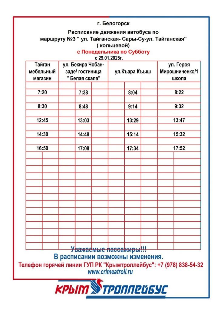С 29 января в Белогорске начнет работу новый кольцевой автобусный маршрут №3 «ул. Тайганская — Сары-Су — ул. Тайганская». Обслуживание маршрута будет осуществлять Белогорский участок автоколонны ГУП РК «Крымтроллейбус».