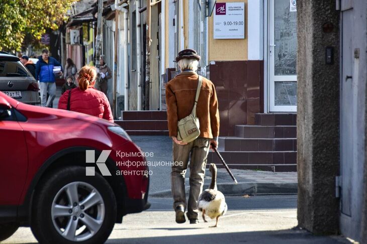 В Симферополе фотокорреспондент «Крымского информационного агентства» стал свидетелем необычного для города явления. На улице Козлова мужчина и женщина как ни в чем не бывало прогуливались с гусем.