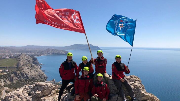 В честь 75-летия Великой Победы спасатели водрузили знамя Победы на горе Сокол в Судаке