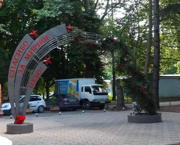 Новый арт-объект занял свое место в парке перед входом на аллею пионеров-героев, со стороны улицы Киевская. Металлическую конструкцию украшают цветы, гирлянда из еловых веток и праздничная надпись «Спасибо за мирное небо!». В вечернее время арка будет освещена подсветкой.
