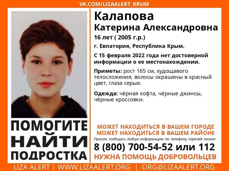 В Евпатории пропала Калапова Катерина Александровна, 2005 года рождения (16 лет). С 15 февраля о ее местонахождении нет достоверной информации. Об этом сообщили в поисково-спасательном отряде «Лиза-Алерт».