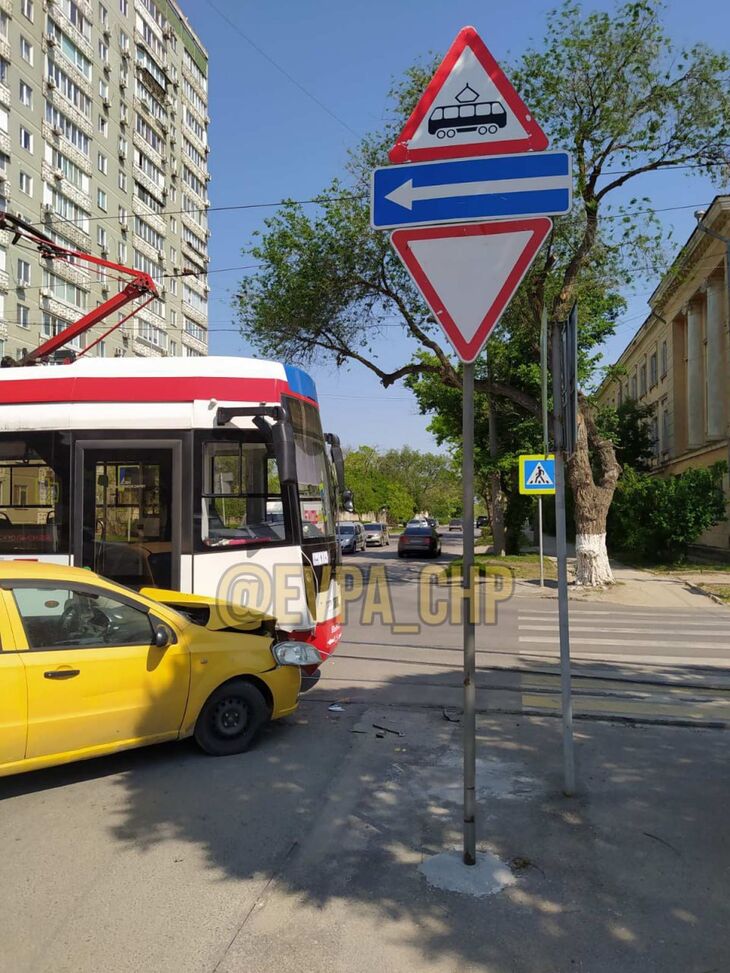 На фото с места ДТП, которое появилось в соцсетях, видно, что автомобиль проигнорировал знаки «уступи дорогу» и «движение трамваев».