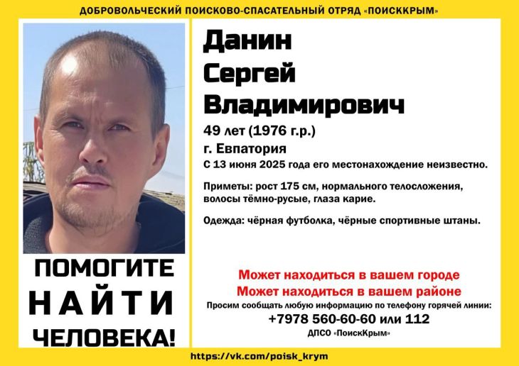 В Евпатории ведутся поиски Сергея Данина. Как сообщили в добровольческом поисково-спасательном отряде «ПОИСККРЫМ» мужчина ушел из дома 13 июня, до сих пор его местоположение остается неизвестным.