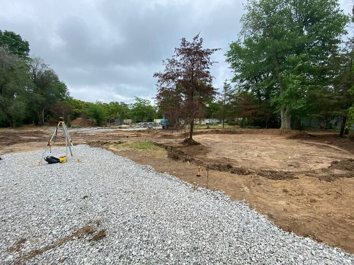 На сегодняшний день ведутся работы по разработке траншеи под размещение труб для полива растений и проводки для уличного освещения, устройству основания под детские площадки, разработке грунта и подготовке площадей под основание тротуарных дорожек.
